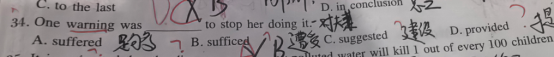 老师解答:句子意思是:提供一个警告以阻止她做这件事。这里就用了被动:一个警告被提供以阻止她做这件事。provide“提供”,suffer“遭受”;suffice“足够,满足…的需要”;suggest“建议”。