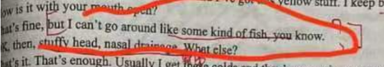 老师解答:这句话的理解可以根据前一句来推测,前面有提到他不舒服,有鼻塞,不能很好的呼吸,医生就问张开嘴的时候,呼吸怎么样?病人就说:that’s fine, but I can’t go around like some kind of fish, you know.根据前文可以得知这句话的意思是:张开嘴可以呼吸,但是我不能一直像某些鱼一样呼吸。